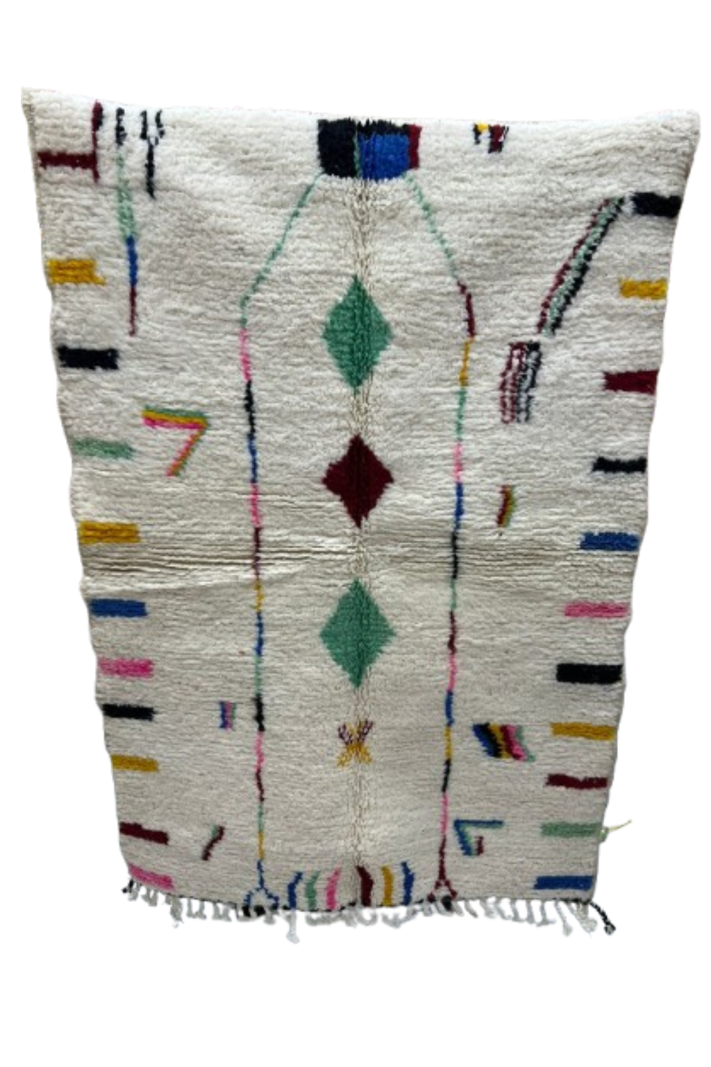 Dit authentieke Marokkaanse Azilal tapijt is een waar kunstwerk voor je interieur. Met zijn frisse ivoorwitte basis en kleurrijke geometrische vormen in groen, rood, geel, blauw en roze, straalt dit vloerkleed energie en creativiteit uit. De speelse patronen zijn geïnspireerd op eeuwenoude Berber symboliek, wat elk tapijt uniek maakt.