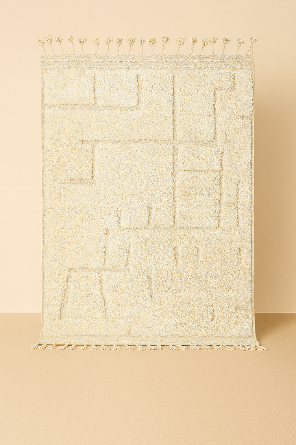 Een handgemaakt kleed dat rust en ritme uitstraalt. De zachte zandkleur en het abstracte lijnenspel doen denken aan een doolhof in de woestijn; speels en minimalistisch tegelijk. Gemaakt van pure wol en met de hand geweven in Marokko. Perfect voor een kalm, natuurlijk interieur met een vleugje karakter.